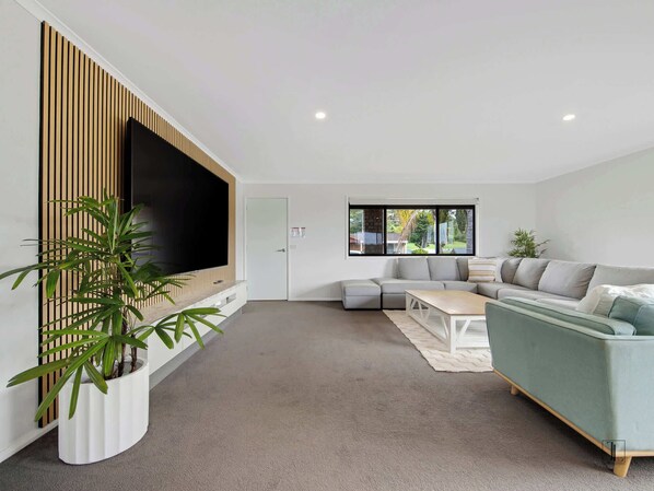 The home features two oversized bedrooms, each with luxurious king beds and occasional seating, including a main bedroom with a queen bed and a private modern ensuite. An oversized lounge room offers the perfect place to relax, complete with a massive TV for movie nights after a day at the beach.