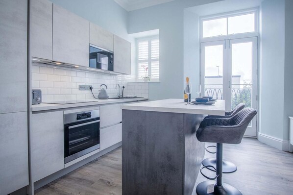 The apartment boasts an open-plan living room and kitchen area, where you can unwind on the comfortable seating while enjoying the entertainment on the smart TV. The fully equipped kitchen is a chef's dream, complete with an induction hob, a full-sized fridge freezer, and even a dishwasher to make your stay hassle-free. The kitchen island with two bar stools provides the perfect spot for enjoying a delicious meal after a day of exploration.