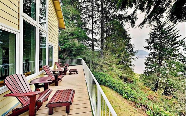 Take the trail down to the shoreline and placid waters of Netarts Bay. Or, you can take delight in panoramic forest and bay views on the spacious deck. The main living area also features large windows that showcase filtered 180-degree views of the bay. In the evening, light the gas stove and choose from a host of board games. Gather for favorite shows on the TV in the loft, featuring a desk and weight machine. Or settle in with a good book in the sitting area in the casita.