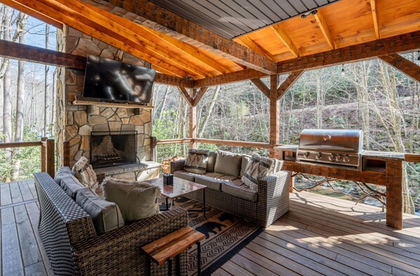 The main floor great room boasts a 20-foot cathedral, exposed beam ceiling and a stacked stone, floor-to-ceiling gas log fireplace that can be enjoyed from both the living room and the master bedroom. You can revel in the soothing sounds of the creek from any room in the cabin.