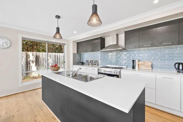 The modern, fully equipped kitchen features stainless steel appliances and a large walk-in pantry. Families will appreciate the inclusion of children’s crockery, cutlery, and cups, making mealtimes a breeze. Overlooking the dining and living zones, the kitchen’s open layout keeps everyone connected during meal prep.