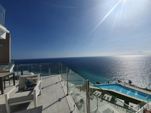 The terrace area is ample and has a dining area with table and chairs as well as an exterior 'chill out' area comprised of aluminum and textiline sofa and chairs. Two foldable sunbeds are provided. You will never tire of the views including communal swimming pool and grounds, the meditteranean sea in it's entirity and if you are lucky you will see dolphins frolicking at certain times of the day.