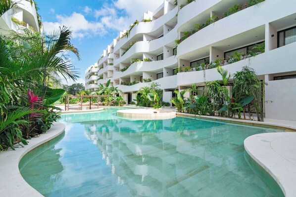 ✺ Meandering tropical pool surrounded by lush vegetation