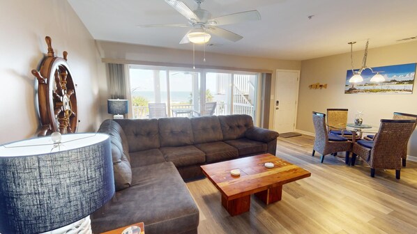 The living room features a large sectional sofa and flat-screen TV, perfect for cozy movie nights or afternoon naps after the beach. The kitchen is fully equipped with stainless steel appliances, ample counter space, and countertop seating for three—ideal for quick breakfasts or evening cocktails. A dining table just steps from the sliding glass balcony doors allows you to enjoy your meals with water and beach views. Both bedrooms are thoughtfully furnished with king-sized beds, offering a restful night’s sleep, while two full bathrooms and a washer/dryer add to the convenience of your stay.