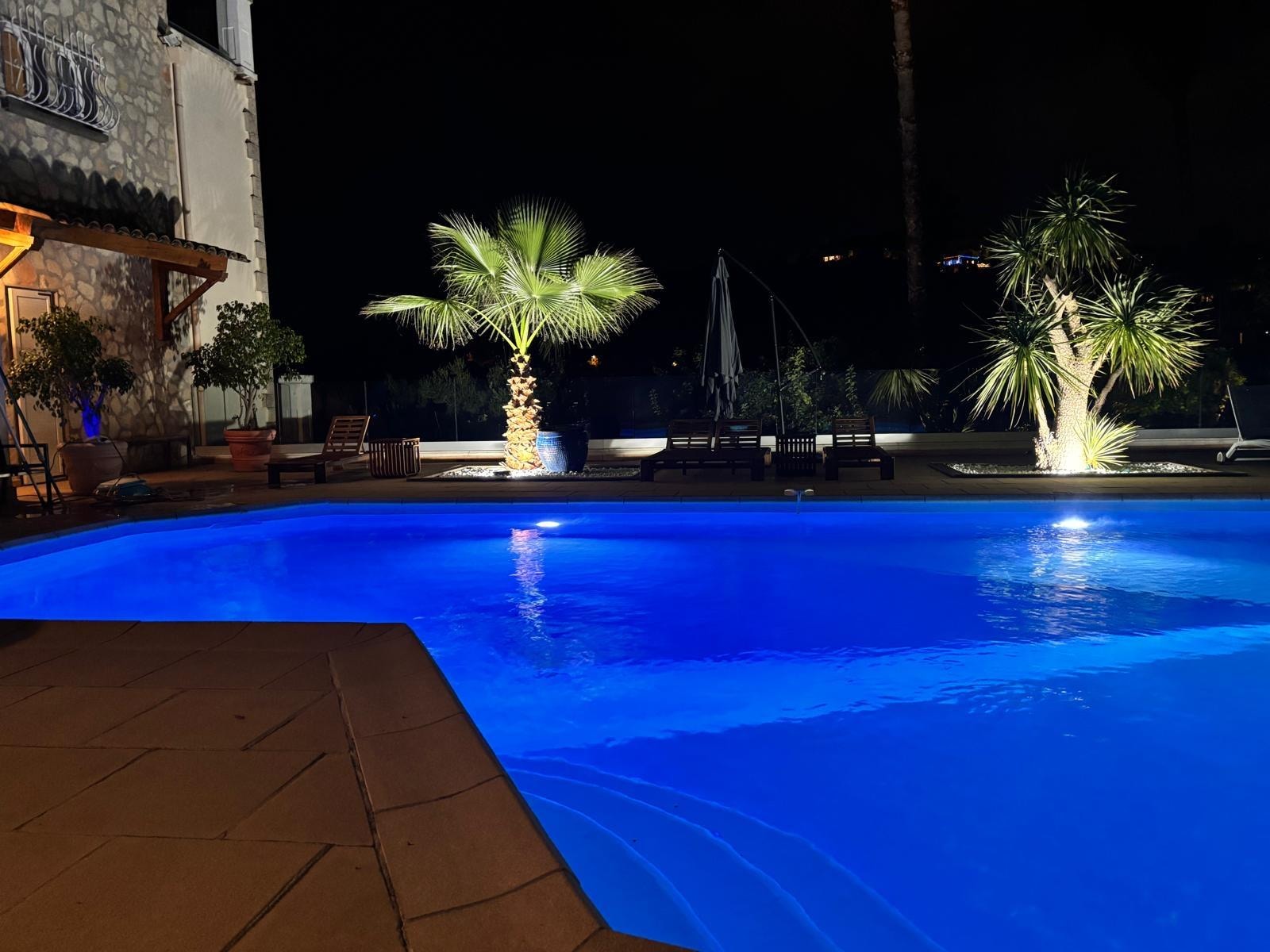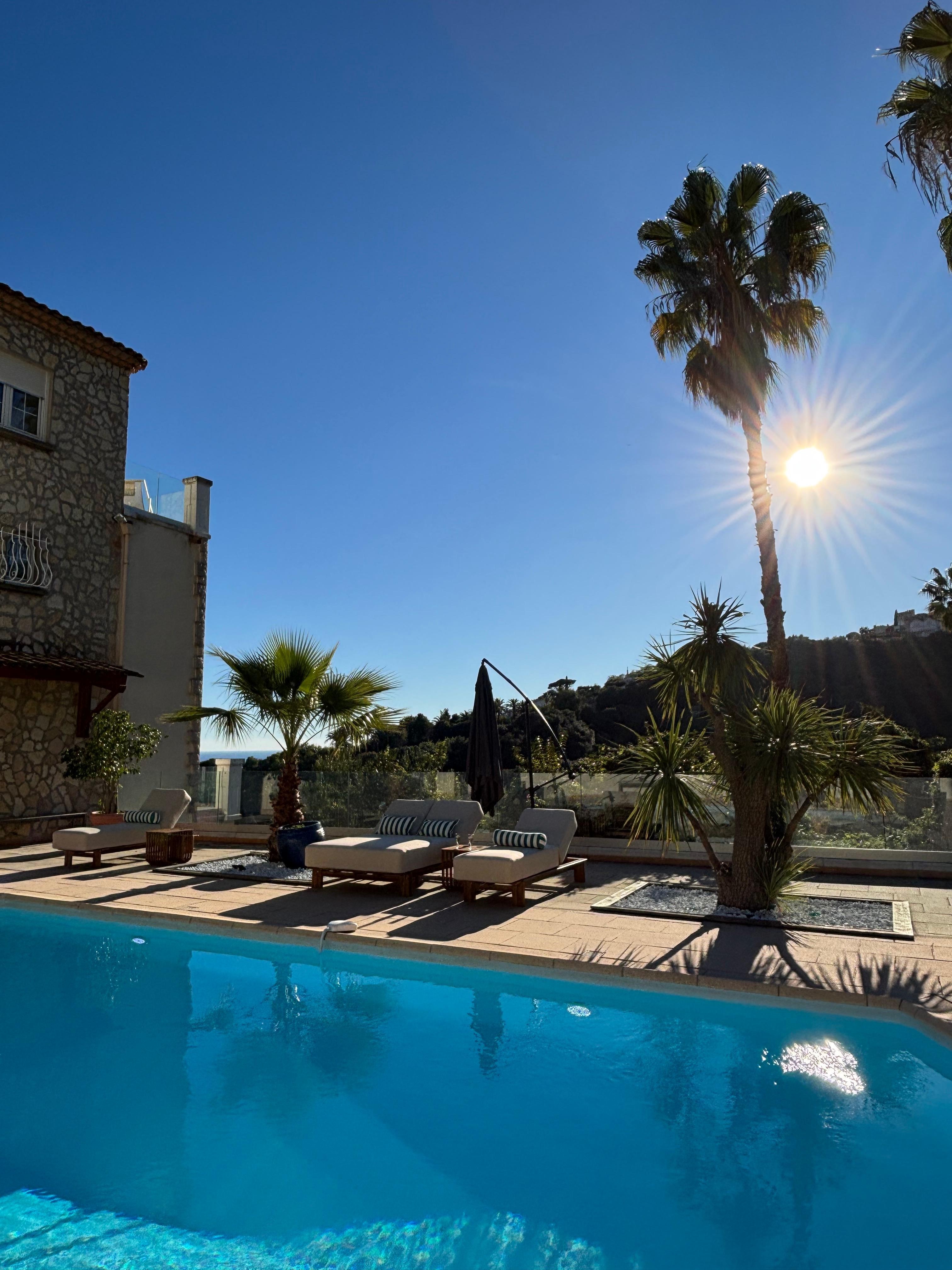 ☀️ Your private outdoor oasis: a large heated pool, no extra fee from May to November, and available year-round upon request (€100/day, 72h notice required, subject to weather conditions). A luxury 5-seater jacuzzi with built-in sound system and sun loungers overlooking the Mediterranean complete this idyllic setting.