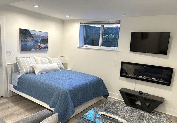 Unwind by the fireplace, stream a movie on the SMART TV, or curl up with a good book on the cozy sofa. Please note that this is a studio with the bed located in the main living area like in a hotel room.