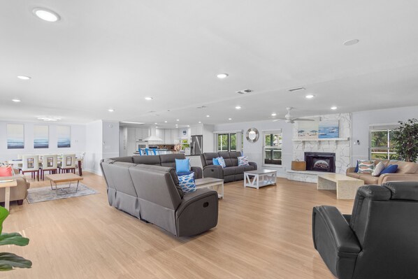 The Space: Spacious open plan living/dining and kitchen, 5 bedroom, 3 bathroom home. Plenty of seating for everyone and 75" TV in the living room. Large front and back yards and screened in heated/chilled salt water pool. You'll have tons of fun with indoor and outdoor games including Fooz Ball, Bumper Pool, Ping Pong, Dart Board, Disc Golf Course, Corn Hole and Jenga.