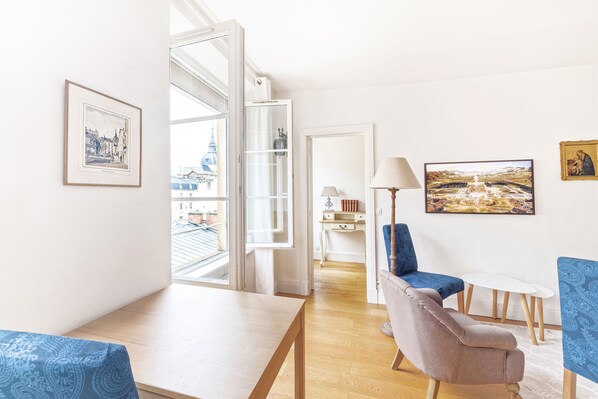 Vintage French apartment with winding stairs and tall windows. A coffee shop is to the right, a market is to the left and the area if flooded with restaurants and bakeries. Great local, very nice unit. Wake to church bells every morning. A short walk to the train station and off you go to any location in the region.