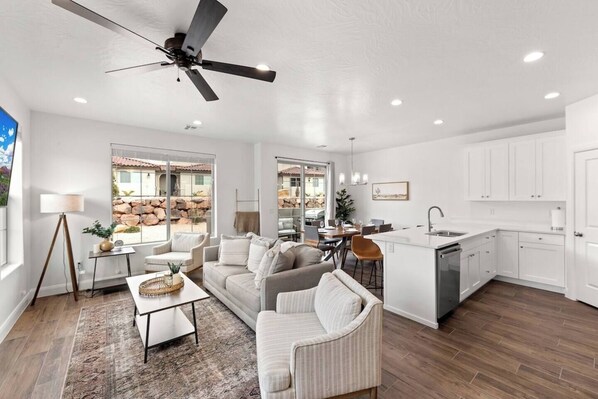 LIVING: Private patio, smart TV, ceiling fans, living room, laundry room