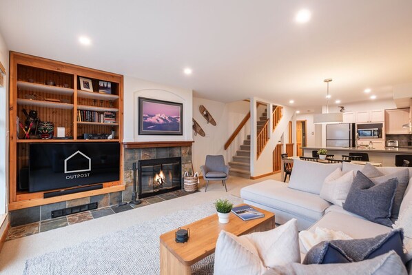 This contemporary Whistler 3 bedroom townhome offers all you need to maximize your getaway in the mountains. The home backs onto pine trees giving a secluded cabin feel, but also offer maximum convenience with a stop for the free shuttle service right outside the property complex. Guests can utilise the adjacent walking path which allows you to be steps from the Blackcomb Gondola and Upper Village's restaurants/shops or Lost Lake. Enter the main living space and be greeted with elegant, modern design. Enjoy open concept living and feel like a top chef in your fully equipped kitchen with stainless steel appliances. Cozy up in front of the wood burning fireplace after an epic day on the slopes. Main floor also offers a bedroom with king split bed configuration, and renovated bathroom with walk-in shower. On the upper level, you will find two modern yet cozy bedrooms (king & king split bed configurations) and renovated ensuite bathrooms. This townhome also features a private garage for securely storing your mountain toys, a rare amenity in Whistler.