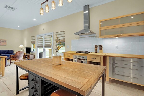 The full kitchen is a highlight, with ample counter space, a unique island with built-in barstools, and all the essentials, including a full-size refrigerator, gas range, oven, dishwasher, microwave, and coffee pot. Whether you’re preparing a romantic dinner or assembling a quick snack, this kitchen has everything you need. The adjacent dedicated workspace can double as a serving area, ideal for laying out a charcuterie board or buffet-style meal.