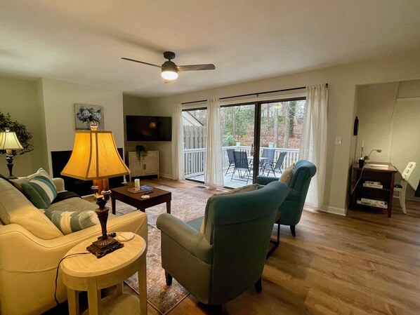 Experience Winston-Salem like a local in this pet-friendly 2-bedroom end-unit townhome with detached carport. Guests enjoy a recently remodeled upper-level space featuring a king bed and a crib in the primary bedroom with ensuite bathroom complete with a tub/shower, outfitted with towels, linens and hairdryer. A spacious second bedroom with large closet has access to an across-the-hall full bathroom with shower. This layout works perfectly for families or friends! In the kitchen are glossy granite counters, modern under cabinet lighting and stainless appliances, where guests can enjoy easy meal prep and cooking on a smooth top electric range. Our kitchen is well-stocked with dishes, pots and pans, cooking utensils and small kitchen appliances (crock pot, blender, hand mixer, toaster/air fryer, food processor, etc), as well as a Keurig Duo, with both traditional coffee pot and single pod brewing. A thermostat is located in the foyer, allowing you to adjust to just the right temperature for the most comfortable stay. Enjoy the sights and sounds of nature while sipping an evening cocktail in a serene, semi-private back patio with gated access to the natural area in back. It's a perfect space for your leashed pets to enjoy. Please note that townhome entry requires climbing exterior stairs as pictured. We look forward to welcoming you to our place!