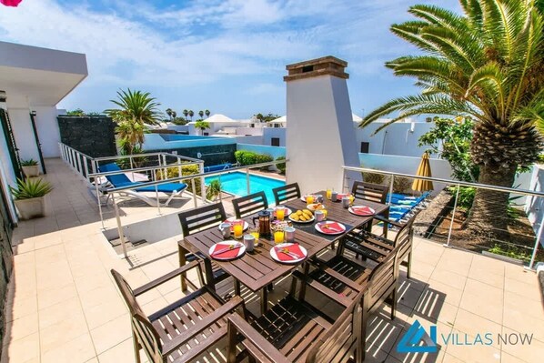 A pretty walkway, decorated with Bougainvillea leads you to the upper floor of Villa Timanfaya where 4 lovingly decorated bedrooms are. 2 kingsize bedrooms, both with ensuite bathrooms and french windows with views of the ocean, lead onto an extensive upper terrace. Overlooking the pool and with one of the villa's stunning outdoor dining areas, this is the perfect place to catch the sunrise with a coffee or enjoy early evening drinks together.