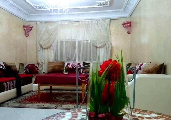 Agadir direction for a pleasant family holiday in a beautiful two bedroom apartment living room perfectly located just 10 minutes from the beach, 5 minutes walk from the grand souk Alhad and 15 minutes from the Marina. Make yourself at home for a weekend or a stay and enjoy a friendly living space where all the amenities necessary for your comfort are met: a large Moroccan living room, a master bedroom, a room for children , a bathroom and a fully equipped kitchen. Several shops, cafes and restaurants are in the immediate vicinity of the residence.