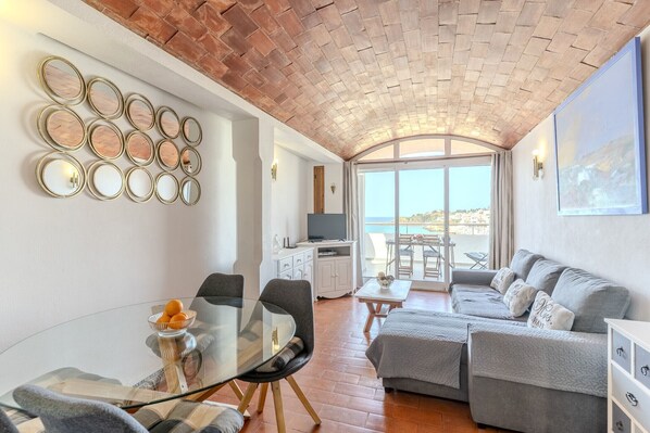 A lovely balcony provides a perfect spot to enjoy morning coffee, offering a pleasant outdoor space to relax with an amazing view. The apartment includes practical features such as WiFi, a TV, and a seating area with a sofa, creating a homely atmosphere.