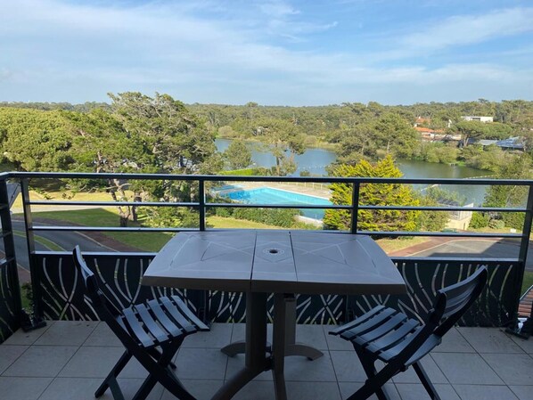 Le logement se compose d’une pièce de vie lumineuse avec un coin cuisine entièrement équipé, incluant un lave-linge ( neuf novembre 2025). Cet espace s’ouvre sur une agréable terrasse offrant une vue dégagée sur la piscine et le lac. Côté nuit, vous disposerez d’un canapé-lit confortable de 160 x 200 ainsi que d’un espace cabine avec deux lits superposés de 80 x 190, sans barrières, recommandé pour les enfants à partir de cinq ans.