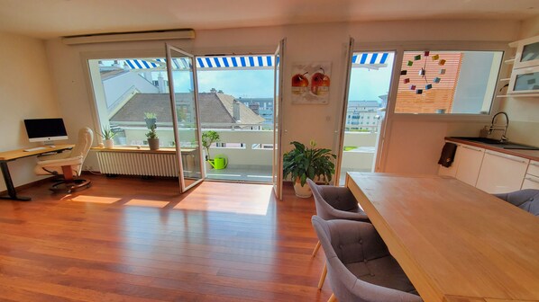 We love Annecy and have visited it a number of times. This apartment is situated on the 6th floor so is very light and airy, with mountain views from the bedrooms. It is very well-equipped, particularly if you are self catering, and our children (6 & 8) really enjoyed playing with all the games and toys. It is located just opposite the Courier shopping centre, which has lots of good shops including a Monoprix, where you can get lovely fresh bread and croissants in the morning. The old town and lake is a pleasant 10-15 minute walk southwards along Rue Carnot, and the bus and train stations are very close (5-10 min walk). Mathieu, the owner was very helpful both before and during our stay, and responded very promptly to my email queries regarding transport options from Geneva (we ended up catching the bus which was very convenient as it runs direct from the airport to Annecy bus station). I would thoroughly recommend this apartment- Thank you for a lovely stay!