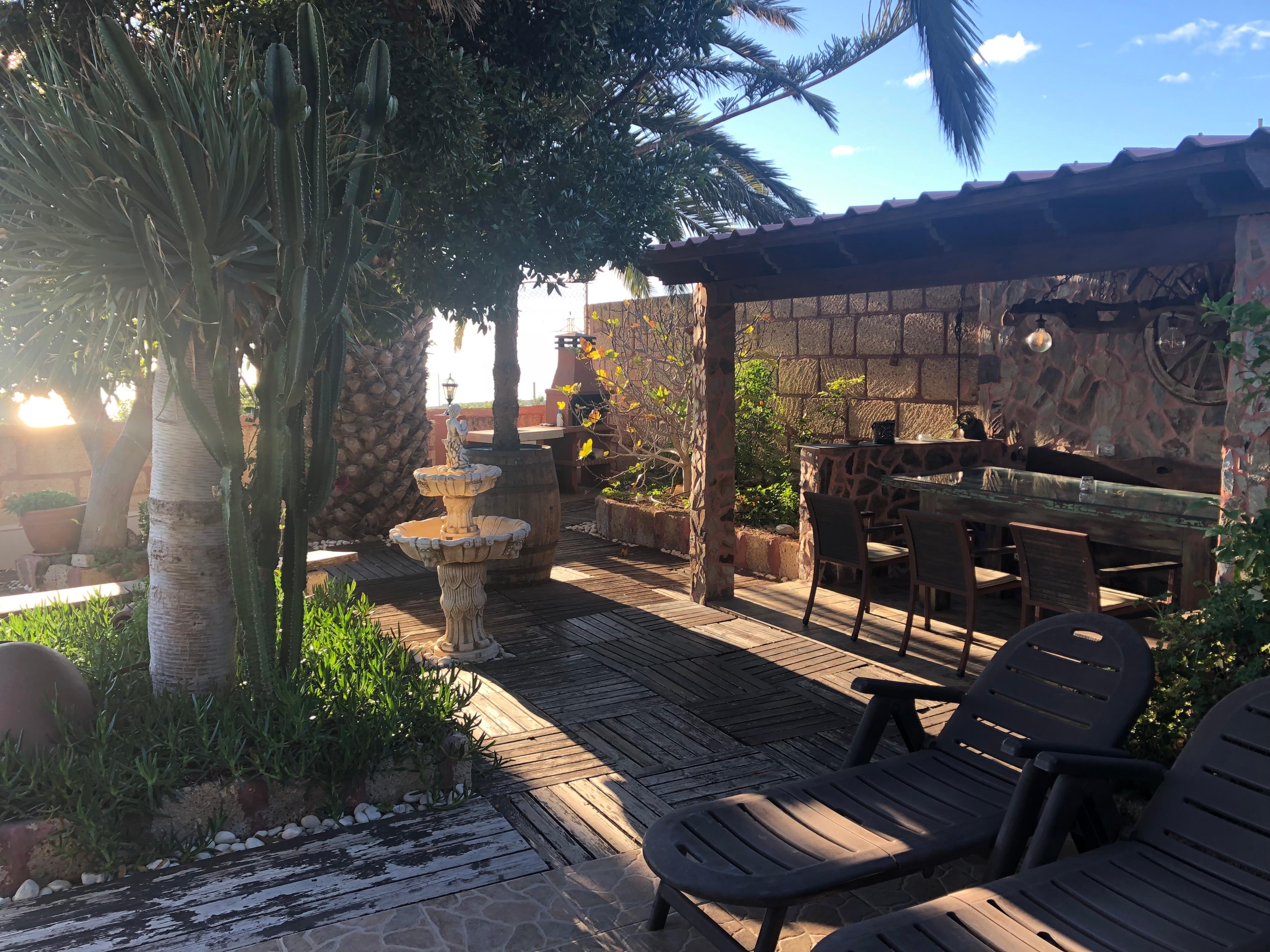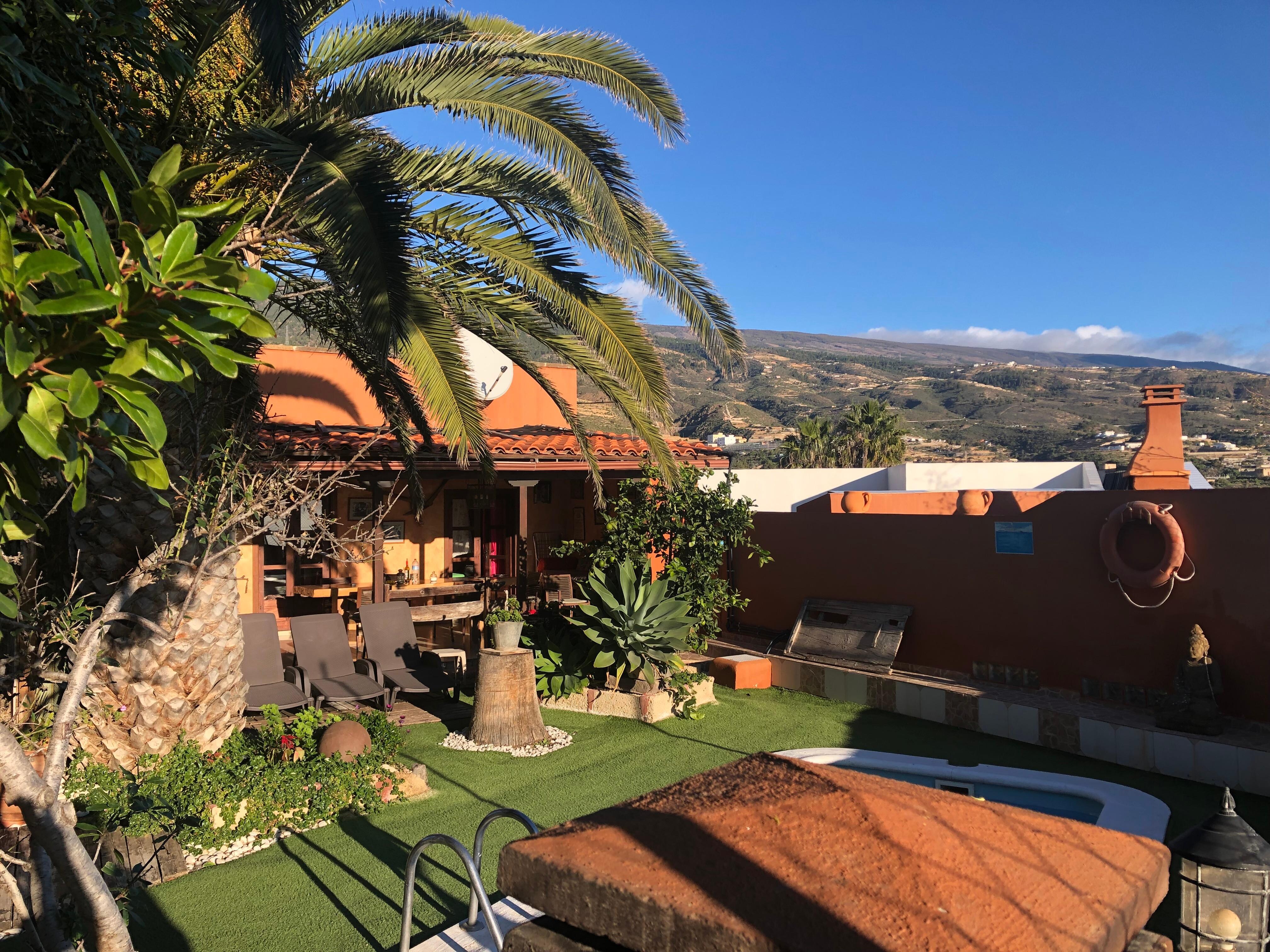 jardin aménagé aménagé. La villa comprend 3 unités adjacentes, Almendro 1 + 2 + 3, les unités 1 + 2 ont 2 chambres chacune pour 4 ou 5 personnes, l'unité 3 avec 3 chambres à coucher et deux salles de bain, est préparée pour 6 personnes. Avec la location simultanée des 3 unités, la CASA ALMENDRO peut accueillir confortablement 15 personnes, des lits supplémentaires sont possibles. Le jardin est luxuriant et planté de végétation tropicale. Vous pourrez donc vous détendre à l'ombre des pommes, des bananiers, des dattes, des figuiers, des kaki, des oranges, des citronniers et des amandiers, le «Almendros» au bord de la piscine. La maison de campagne romantique est équipée de tout le nécessaire pour préparer des délices culinaires. Pour un plat épicé de Charcoal Grill ou un Pata Negra, l'excellent jambon espagnol, vous pouvez