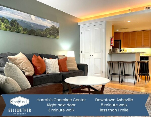 The apartment is conveniently located to all of the downtown Asheville amenities. The parking space made it possible for us to park at the condo and walk everywhere. The apartment is perfect for two people - spacious and well appointed. Our issues were with checking in and the TVs. There are electric keypad locks on both the building entrance and on the condo entrance, each with its own code. The check in instructions gave us only the condo code, so we couldn't get into the building. The owner/manager responded quickly to our text and helped us get in. Each TV had two remotes and there were no directions on how to use them. To complicate matters, there was only one set of charged batteries. The owner/manager texted to ask us how things were going on day two of our trip and I mentioned the TV issue. We didn't hear from him again.