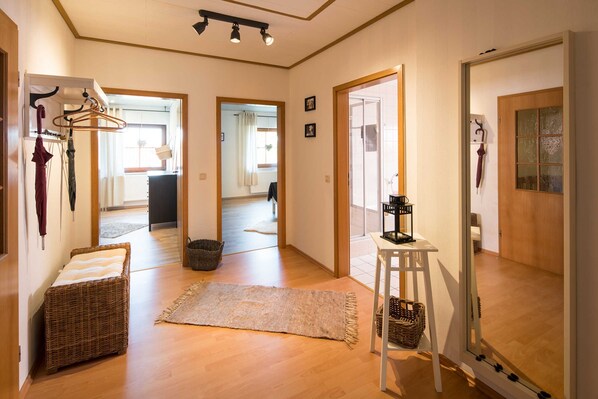 The extensive and modern renovated apartment is located upstairs and is about 90 m² in size. A spacious balcony with awning on the sunny side invites you to a wonderful view of a beautiful landscape to enjoy the sunset on the horizon. It offers ample space for 1 to 4 people through a large, cozy living room with dining area and two cozy bedrooms. It also has a fully equipped kitchen with sitting area and a bright, comfortable bathroom with shower to refresh and bathtub to relax. A parking space for cars next to the house and a lockable Fahrradunterstellmöglichkeit are of course. Likewise, a carport is available for the parking of motorcycles. Wifi, bed linen and towels are also available at no extra charge