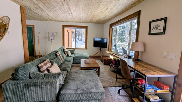 Welcome to Wolfcamp, a haven of tranquility and comfort nestled in the heart of a picturesque winter wonderland. This charming chalet, ideal for families, friends, and explorers, boasts three beautifully furnished bedrooms. The master suite features a plush king-sized bed, while the other two bedrooms each offer a cozy queen-sized bed, complete with dedicated workspaces. This makes Wolfcamp an ideal retreat for up to six guests, offering a perfect blend of relaxation and functionality.