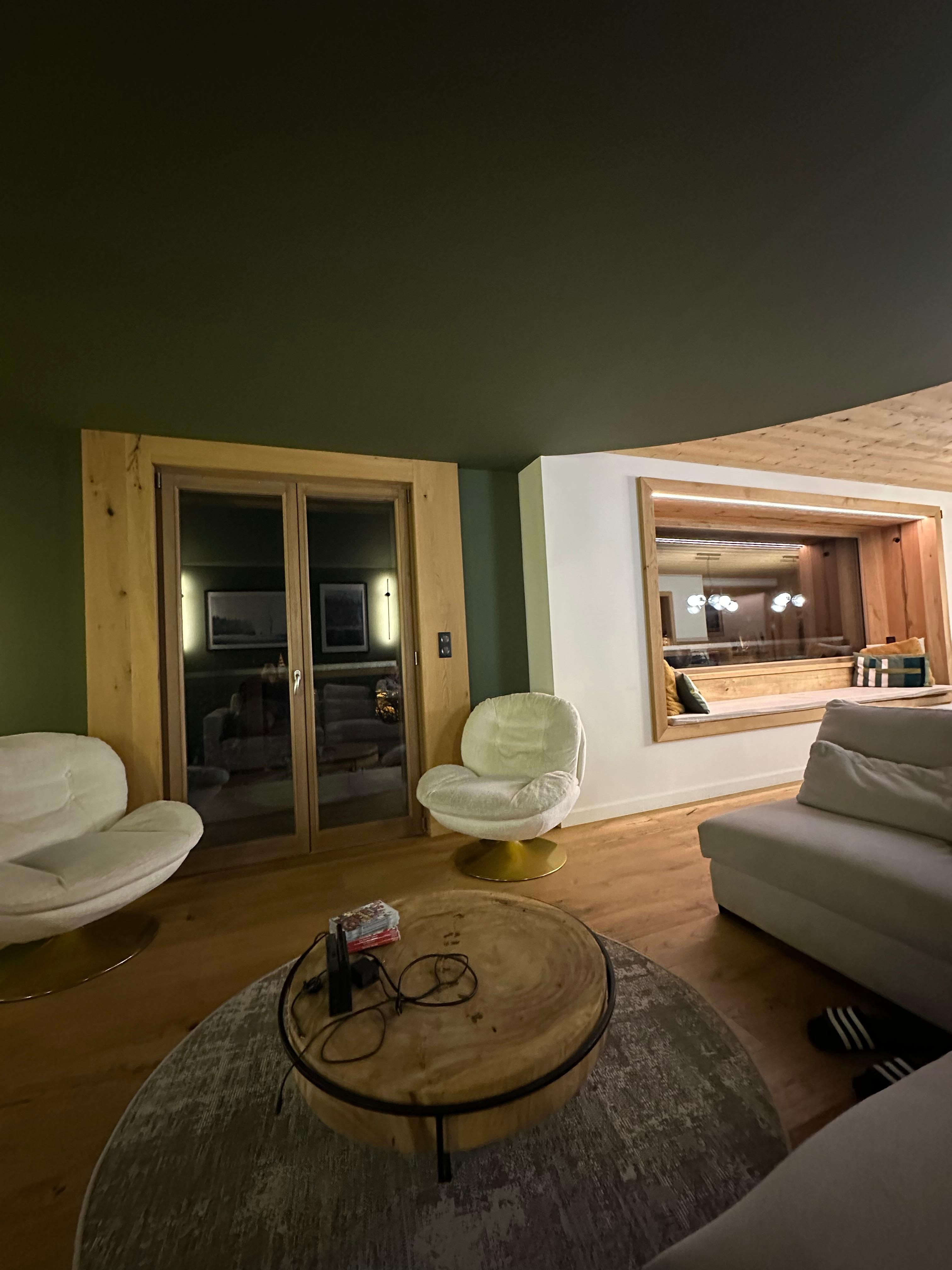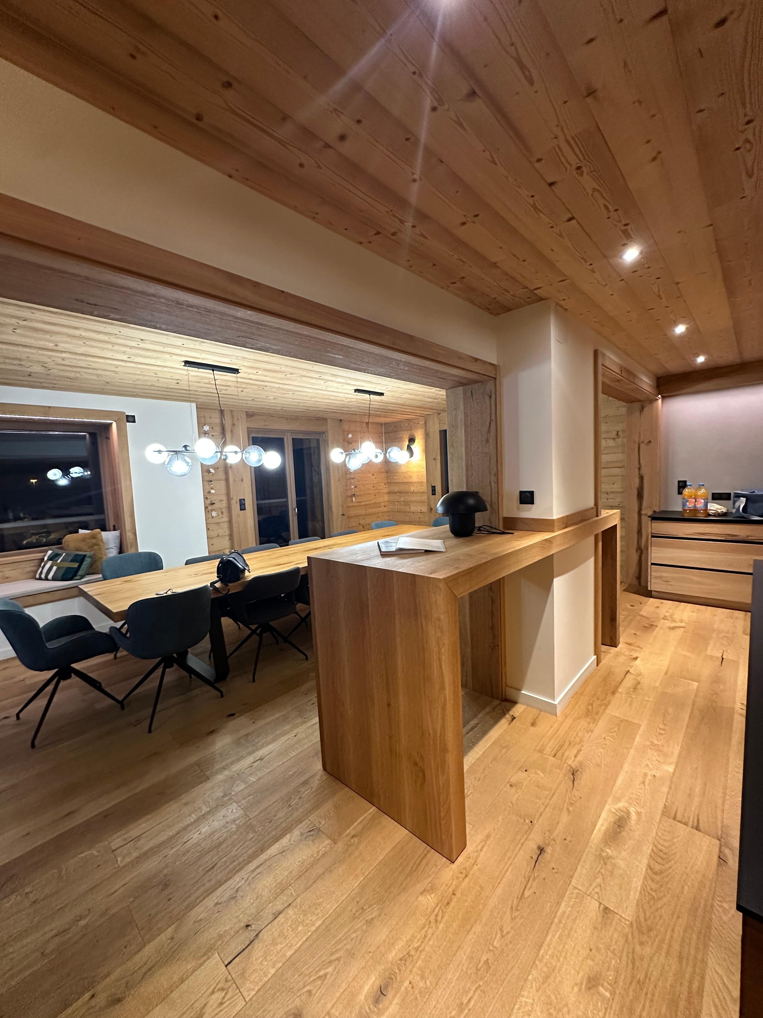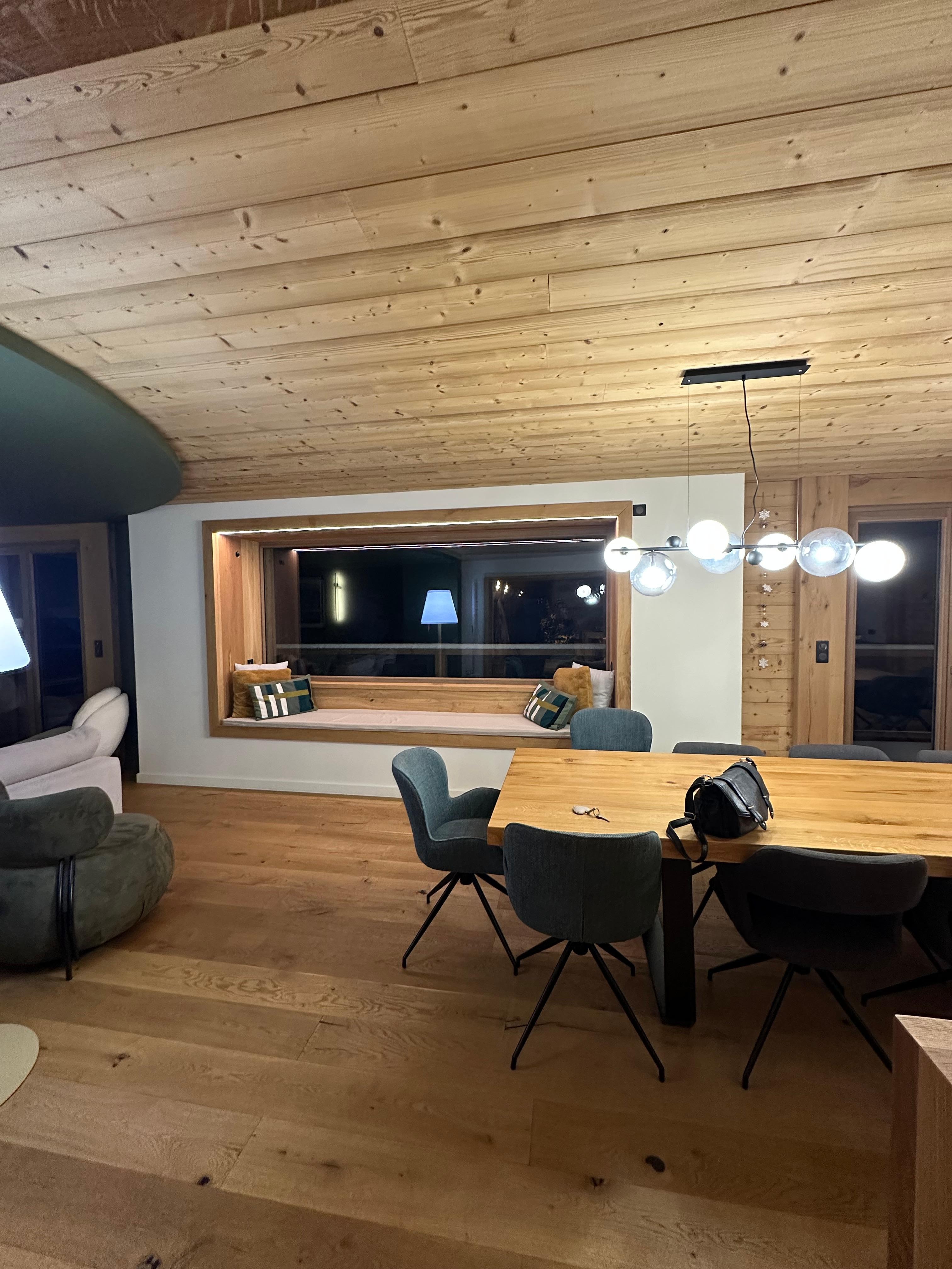 Vous profiterez d’un espace de vie de 73 m² sublimé par une Alcôve où vous pourrez admirer la magnifique vue sur le lac et les forêts environnantes. Offrant une grande table faite sur mesure pouvant accueillir 14 personnes, d’une cuisine, d’un espace bar et d’un coin salon, vous pourrez profiter de moments conviviaux.