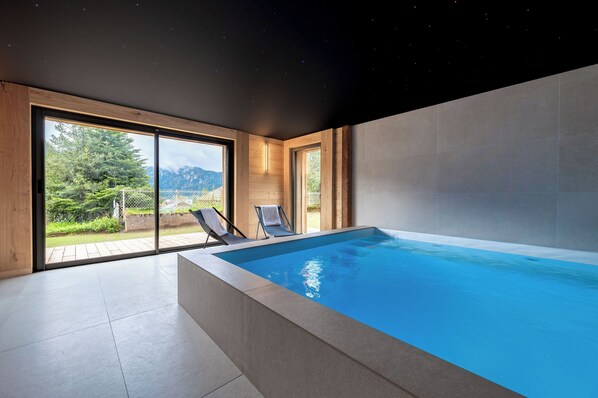 La piscine intérieure/spa XXL avec grandes banquettes, jets et bulles sous son ciel étoilé vous fera profiter d’un moment de bien-être atypique. Elle permettra également aux plus petits de profiter d’une piscine quelle que soit la météo