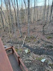 Step outside onto the main-level deck, where comfortable seating invites you to relax and enjoy the tranquility of the wooded surroundings. Whether sipping your morning coffee or sharing stories from the day, this outdoor space is the perfect complement to your mountain escape. Stairs lead down to the grounds where you'll find a fire pit. The lower deck gives a second outdoor space to enjoy.