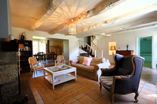 Profitez d'un grand espace spacieux de 30m² avec télévision, ouvert sur un séjour de 15m² donnant sur une terrasse ensoleillée. Parfait pour des moments de détente ou des repas en plein air 🌞.
