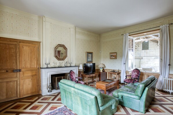 - 25 m² living room with sofa, TV, dining area, fireplace (wood provided)