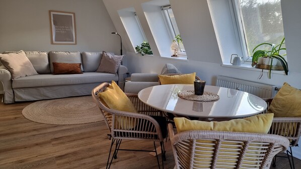 Die Wohnung ist super und perfekt ausgestattet. Es hat wirklich nichts gefehlt!! Nur die Badewanne war unter der Dachschräge- das ist ein bisschen ungeschickt für größere Leute zum duschen.