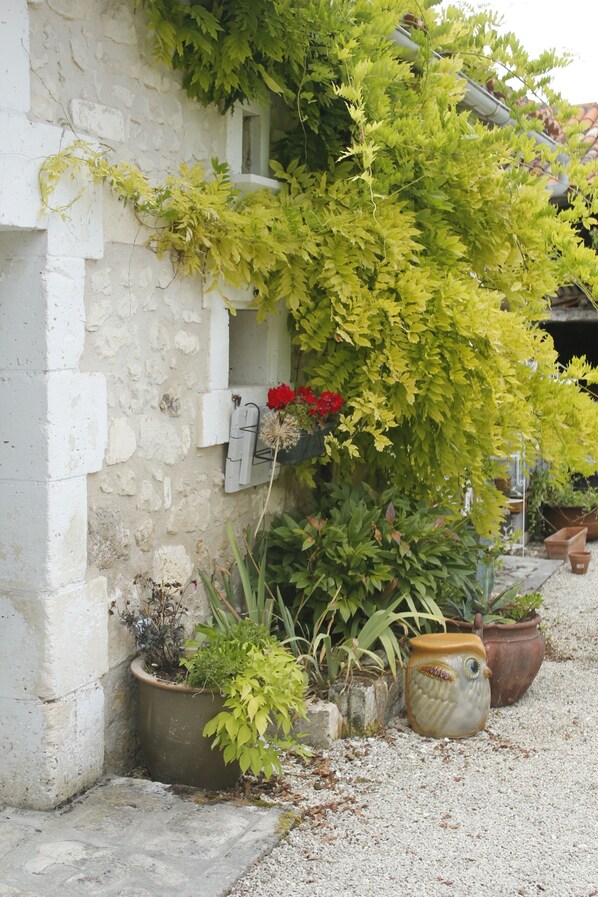 En passant par l'arc de la propriété, on entre dans la belle cour de La Grange, vous trouverez La Tanière, à droite, et caché du bâtiment principal, vous trouverez le joli gîte de deux chambres, La Maison du Jardin.