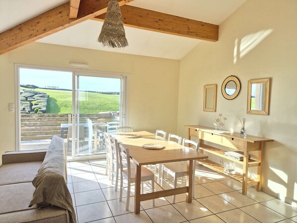 En bordure de plage, au pied de la dune en herbe, villa jumelle de 100m² pouvant accueillir jusqu'à 6 personnes, avec une grande terrasse de 40m² exposée Ouest. Bel espace du séjour lumineux, grandes baies vitrées donnant sur une terrasse privative avec mobilier de jardin. WIFI Emplacement pour garer la voiture sur le terrain. 1 CHAMBRE : 1 lit en 140, placard 1 CHAMBRE : 2 lits en 90, placard 1 CHAMBRE : 2 lits en 90, placard SALLE D’EAU : douche, double vasque WC séparé ETAGE: CUISINE : lave-vaisselle, micro-onde, four traditionnel, plaques de cuisson, réfrigérateur-congélateur, rangement, cafetière filtre et Nespresso CELLIER : lave-linge SALON - SEJOUR : table, chaises, canapé, télévision WC