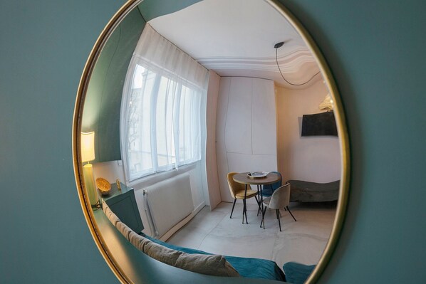 Chaque appartement combine salon et chambre pour un espace de vie pratique et chaleureux. Le salon dispose d’un canapé, d’une table basse, d’une télévision, du Wifi et d’un espace de rangement. En soirée, il se transforme en chambre avec 3 lits simples (90x200 cm). Depuis 2026, le lit d’appoint a été remplacé par un vrai lit simple pour plus de confort.