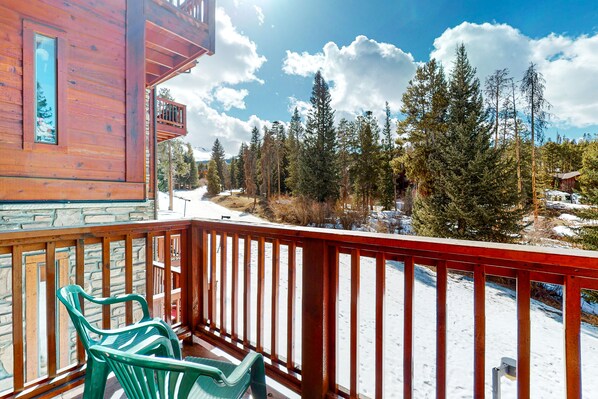 2nd-floor ski-in condo with balcony, hot tubs, fireplace & gym