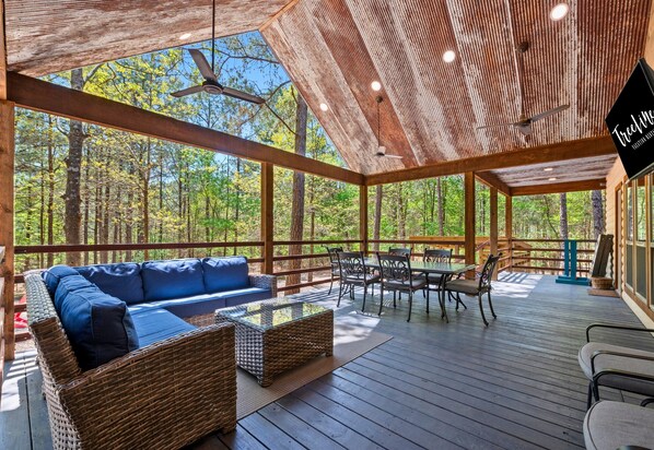 Out back, nature takes center stage. The covered hot tub and outdoor dining area make it easy to kick back, and the fire pit is a go-to spot for s’mores and stories. The untouched woodland behind the cabin gives you a front-row seat to peace and quiet, with 1,000 acres of forest stretching beyond. And when you’re ready to explore, Broken Bow has it all—crystal-clear lake days, trails through towering pines, and local spots to eat, sip, and shop in Hochatown. Drift Inn is a laid-back, memory-making kind of place that brings the best of the area right to your doorstep.