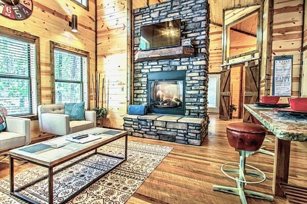 Le plan d'étage intègre gracieusement les espaces intérieurs et extérieurs, permettant une vie simple mais sophistiquée. Un espace en plein air couvert et isolé capture un cadre agréable et pittoresque avec un véritable foyer au bois en pierre du sol au plafond. Qui n'aime pas les brochettes fraîches du grill? Avec un barbecue au propane et une table à manger en plein air pour quatre personnes à port��e de main, vous pouvez le faire! Après une longue journée passée à profiter des activités de plein air autour de la cabine, vous pourrez vous détendre dans le bain à remous et régénérer votre corps et votre esprit. Ce spa spacieux est prêt à accueillir jusqu'à 4 à 5 personnes. Parce qu’un voyage dans les bois n’est pas complet sans un endroit pour griller un hot-dog au-dessus d’un feu ouvert, un foyer sur mesure complète ce paysage extérieur à la perfection.