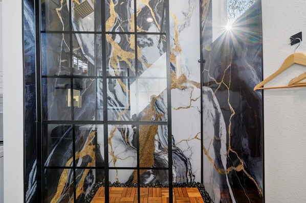 Private bathroom in the separate wash house building. Custom luxury spa like bathroom includes a beautiful shower, washer and dryer and everything required for your bathroom and laundry needs.