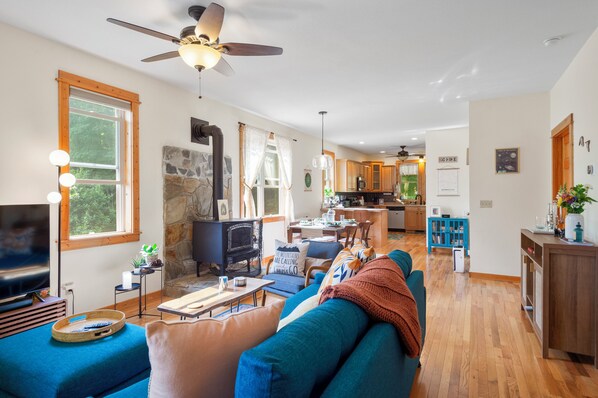 Our cottage is the perfect homebase for all your explorations. With 2 bedrooms and 1.5 baths on the main floor and a bonus suite on the second level with a private balcony and bathroom, there’s plenty of space and privacy for a group of friends or a multi-generational family trip. We provide amenities to keep everyone happy, like a washer & dryer, wifi, Smart TVs on both levels of the home, and a fully-stocked kitchen. All this on a peaceful parcel of land, where instead of road noise, you’ll hear the music of waterfalls, and instead of light pollution from the city, you’ll gaze at a blanket of stars sparkling in a coal-black sky.