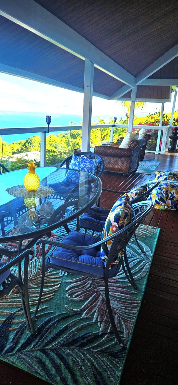 Designed for comfort and convenience, the home features ceiling fans throughout, washer and dryer, and beach gear and toys ready for your adventures. The cozy spacious living room and nearly 800 sq ft wrap-around lanai offer the perfect places to relax and take in the scenery — every room boasts breathtaking ocean views.