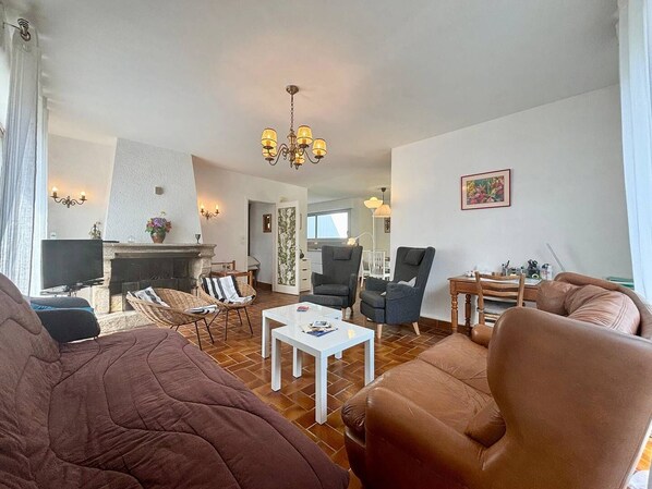 A l'étage : séjour (clic-clac 1x140, TV) avec coin cuisine équipé et petit balcon, Chambre 2 (1x160), Chambre 3 (2x90), Chambre 4 (1x160), salle de bain, WC séparés.