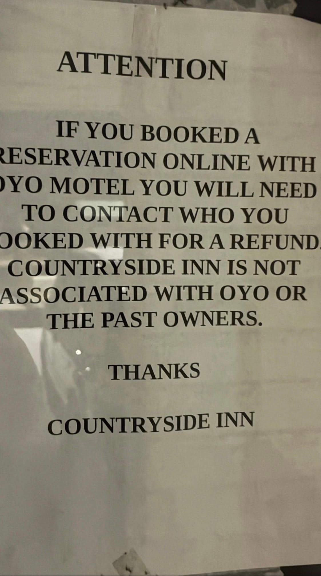 When we arrived, the property looked nothing like the photos. The building was dark, run-down, and clearly not in operation. There were no lights on, no staff, and a sign on the door stating that the “Countryside Inn is not associated with OYO or the past owners” and that anyone who booked online would need to contact whoever they booked through for a refund.