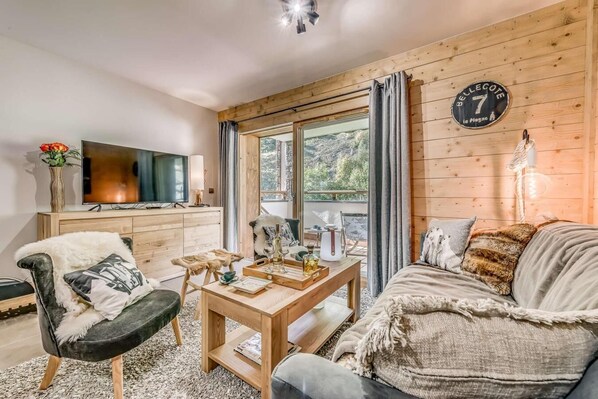 À 50m des pistes de ski, 9ème étage, terrasse, balcon, parking, télévision, casier à ski, 57m²