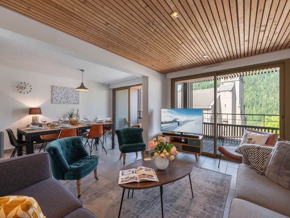 La pièce à vivre, spacieuse, est composée d’une cuisine toute équipée, d’un chaleureux salon et d’un coin salle à manger. Le décor est à la fois contemporain et montagnard, avec sa grande table familiale, ses chaises en peau et ses touches de bois.