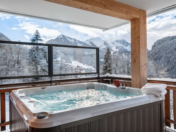Flat A102 has its own private outdoor jacuzzi, with magnificent views over the valley and surrounding mountains.