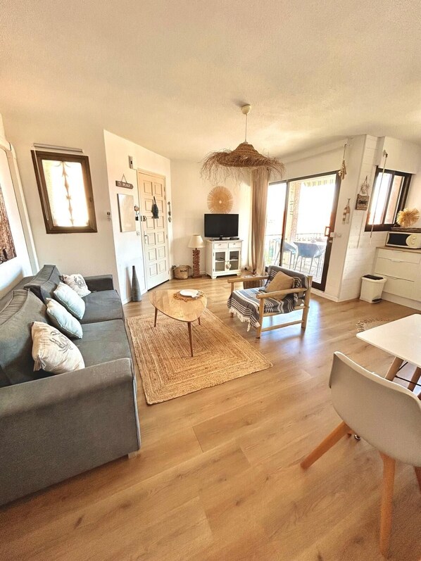 - Une pièce de vie de 28 m², climatisée et orientée sud-est, avec un grand canapé convertible, un coin repas et une TV