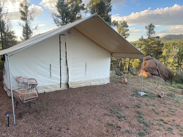 Located at the highest point in Florissant with incredible 360-degree views of the front range, this glamping property is a dream. The Mirage tent is16x20 Glamping tent with a 16x7 front awning. The tent offers 1 queen bed, 1 bunk bed with a twin over full, and a pullout twin underneath and 1 futon/fold down cot. We allow up to 10 guests for this tent, but there are beds for 7, so please bring cots or air mattresses, if you have more than 7. The property has 1 shared outdoor shower and 1 shared porta potty. The property offers a cozy retreat for guests. The soothing atmosphere and heating amenities will ensure a perfect stay for those looking to unwind and relax. Close to several outdoor activity activities, our place will help you feel at home while you're traveling and exploring the area.