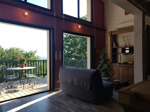 - Espace salon avec canapé convertible (2 places), téléviseur, enceinte connectée et lecteur DVD.