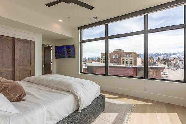Located on the third floor of The Basin Luxury Suites, this stunning, design-forward unit—The Targhee—sits on the south side of the building and is named after one of the Tetons’ iconic peaks. This luxury retreat invites you to connect with the breathtaking natural beauty surrounding you. Whether you're here to relax, explore, celebrate, or work remotely, The Targhee offers an unforgettable experience. Its bold design and dramatic blend of wood and steel accents strike the perfect balance between a rustic mountain escape and a sophisticated city loft.