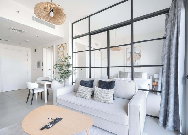 The 1-bedroom apartment offers a bright and airy atmosphere with a spacious open-plan dining and sitting area, complete with a Smart TV, a cozy couch and a dining table. It’s perfect for unwinding after a day of shopping at Dubai Hills Mall, just a 10-minute drive away. Step out onto the balcony to savour your morning coffee.